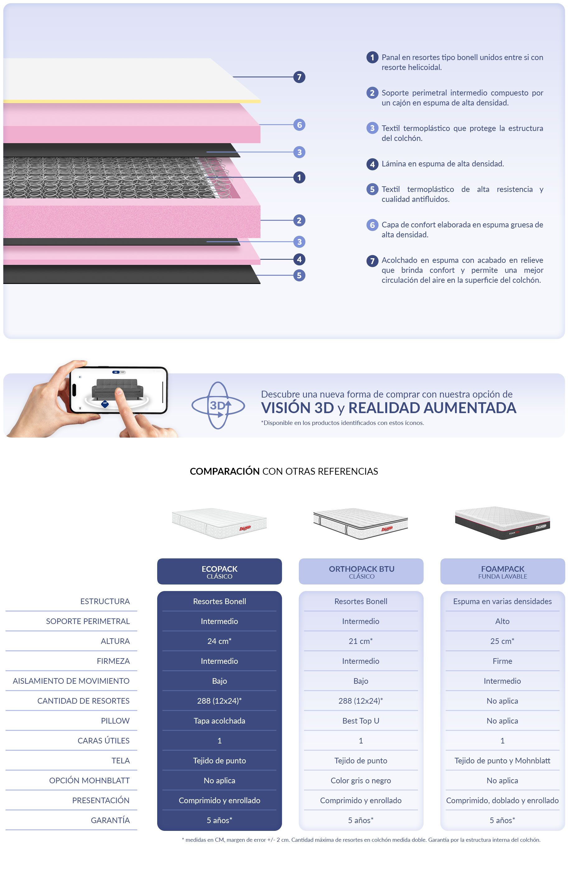El colchón ECOPACK tienen una estructura en resortes tipo bonell que trabajan en conjunto para amortiguar el peso del cuerpo y brindarle un excelente descanso. Cuenta con un soporte perimetral de firmeza media en los bordes del colchón.