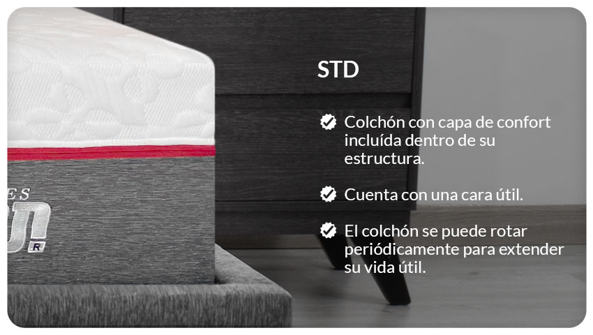 Vive una experiencia única de descanso gracias a una combinación de estructuras en celdas tipo espuma de diferentes densidades y multizonas de transición que le brindarán a tu cuerpo un mejor soporte sin importar la posición en que duermas. Se divide en 3 capas, cada una de ellas con una función en específico que al trabajar en conjunto te harán experimentar un alto grado de confort.