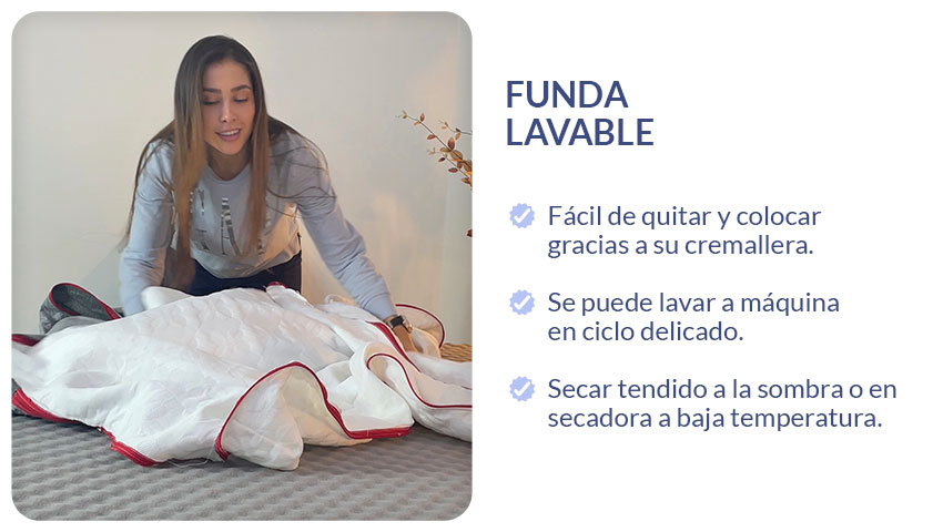 La funda del colchón cuenta con una cremallera que permite retirarla con facilidad para poder lavarla. Se encuentra elaborada en dos tipos de textil. Su parte blanca brinda mayor confort, es de textura suave al tacto y muy fresca, la parte gris se compone por un textil más rígido con propiedades antideslizantes que aumenta la firmeza del colchón para darle mayor estructura.