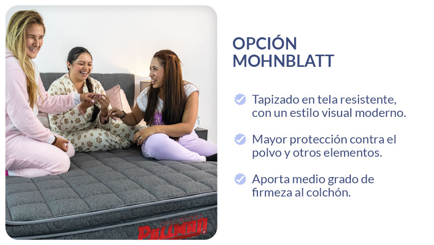 Lleva tu colchón a otro nivel seleccionando la opción Mohnblatt Design. Se trata de tapizar el colchón en un textil resistente como el utilizado en la tapicería de muebles, esto le aporta un toque de elegancia y protección adicional contra el polvo y otros elementos. *Esta opción tiene un costo adicional.