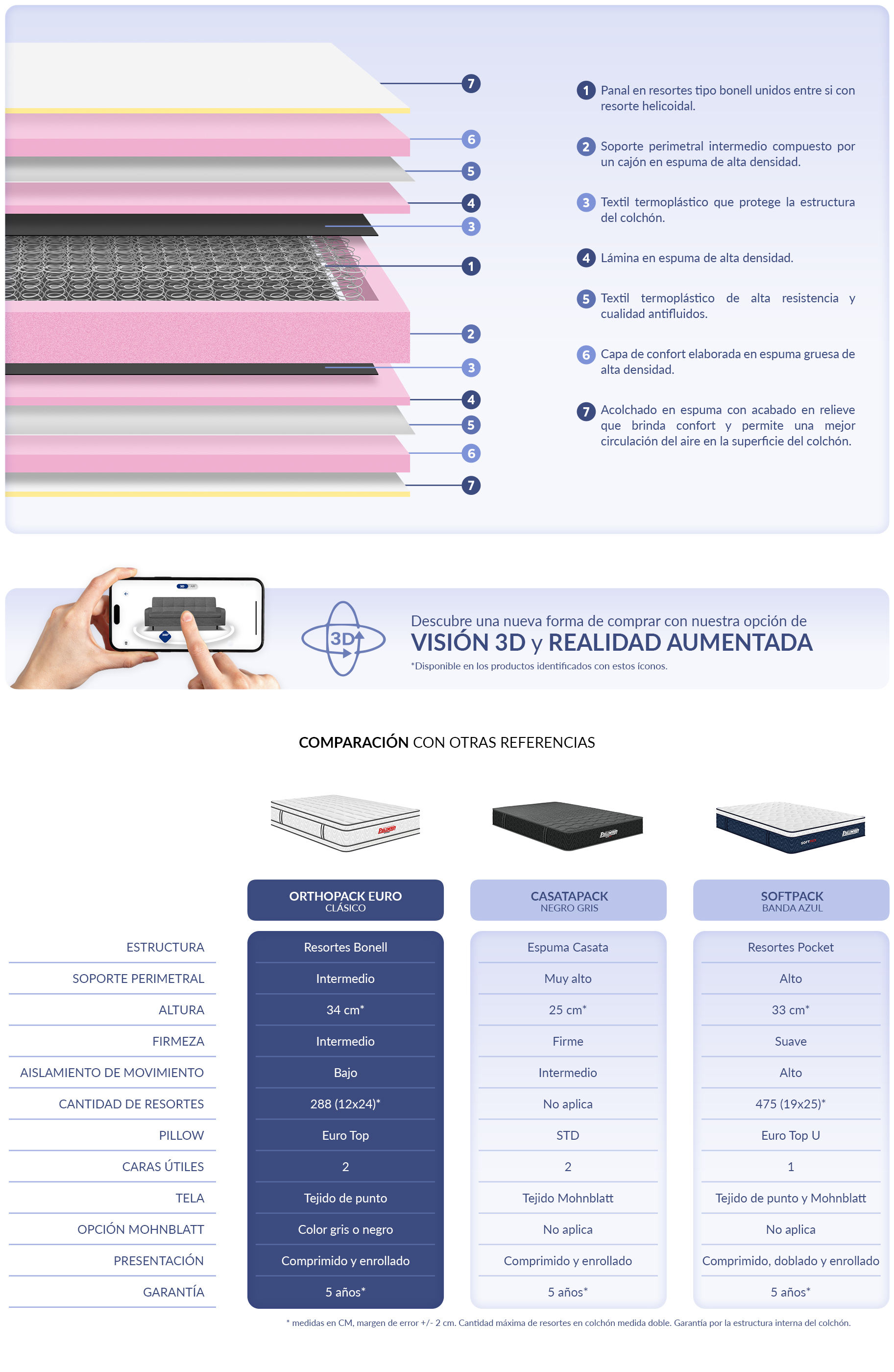 NOTAS GENERALES: oferta solo por los productos descritos, no incluye objetos decorativos ni accesorios. Imágenes de uso referencial, los colores pueden variar según la configuración de su pantalla. Medidas con margen de error +/- 2 CM aprox. 3D Y REALIDAD AUMENTADA: representación gráfica de productos para uso referencial únicamente, los colores y apariencia pueden variar. SOFÁ CAMAS: no son diseñados para utilizarlos como cama a tiempo completo. COLCHONES: la forma del acolchado puede variar sin afectar la calidad del producto. La firmeza hace referencia al grado de dureza de la estructura del colchón, el soporte se refiere al nivel de apoyo que ofrece al cuerpo acostado y el confort indica el grado de adaptabilidad del acolchado a la forma del cuerpo. LENCERÍA: Los productos en empaque plástico requieren ventilación antes de su uso para permitirles recuperar su frescura. Para productos empacados al vacío debe retirar el plástico y esperar unos segundos hasta que retomen su forma original. GARANTÍAS: Para revisar en detalle favor redirigirse a la sección POLÍTICA DE GARANTÍAS.