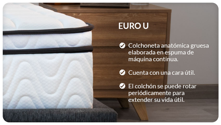 Es un colchón con una cara útil. Cuenta con una colchoneta gruesa adherida en la parte superior para brindarle mayor comodidad y cuerpo al colchón. La parte inferior se constituye por un textil que previene la humedad. Cuenta con manijas laterales que facilitan su manipulación al momento de moverlo.