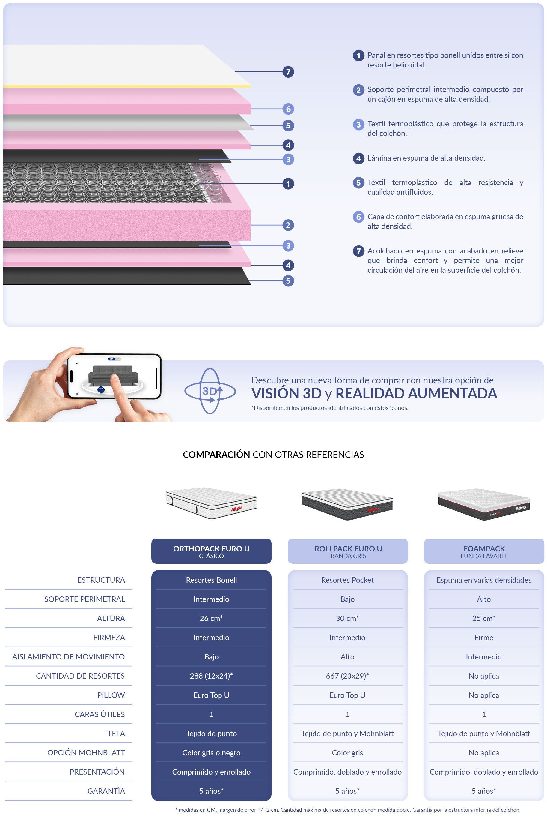 NOTAS GENERALES: oferta solo por los productos descritos, no incluye objetos decorativos ni accesorios. Imágenes de uso referencial, los colores pueden variar según la configuración de su pantalla. Medidas con margen de error +/- 2 CM aprox. 3D Y REALIDAD AUMENTADA: representación gráfica de productos para uso referencial únicamente, los colores y apariencia pueden variar. SOFÁ CAMAS: no son diseñados para utilizarlos como cama a tiempo completo. COLCHONES: la forma del acolchado puede variar sin afectar la calidad del producto. La firmeza hace referencia al grado de dureza de la estructura del colchón, el soporte se refiere al nivel de apoyo que ofrece al cuerpo acostado y el confort indica el grado de adaptabilidad del acolchado a la forma del cuerpo. LENCERÍA: Los productos en empaque plástico requieren ventilación antes de su uso para permitirles recuperar su frescura. Para productos empacados al vacío debe retirar el plástico y esperar unos segundos hasta que retomen su forma original. GARANTÍAS: Para revisar en detalle favor redirigirse a la sección POLÍTICA DE GARANTÍAS.