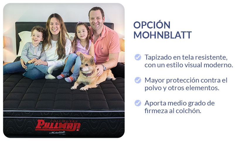 Puedes llevar tu colchó tapizado en nuestra línea Mohnblatt Design. Se trata de una tela resistente como la utilizada en la tapicería de muebles, esto le aporta un toque de elegancia y le brinda al colchón protección adicional contra el polvo y otros elementos.
