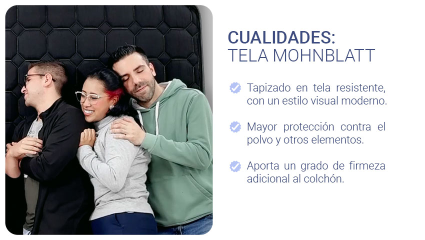 Puedes llevar tu colchó tapizado en nuestra línea Mohnblatt Design. Se trata de una tela resistente como la utilizada en la tapicería de muebles, esto le aporta un toque de elegancia y le brinda al colchón protección adicional contra el polvo y otros elementos.