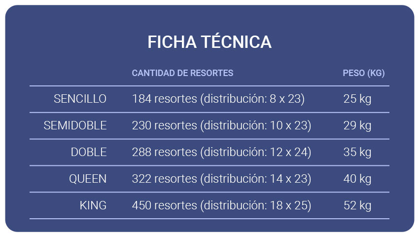 Combinación perfecta entre confort y firmeza. Su estructura es de resortes con forma de reloj de arena que brindan un excelente soporte. Entre las hileras de resortes lleva incrustadas láminas en espuma de casata que le proporcionan mayor firmeza al colchón.
