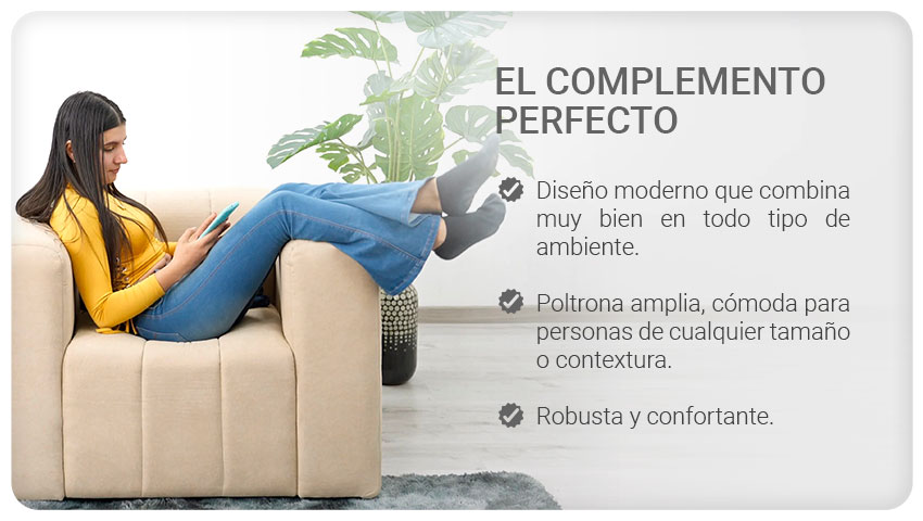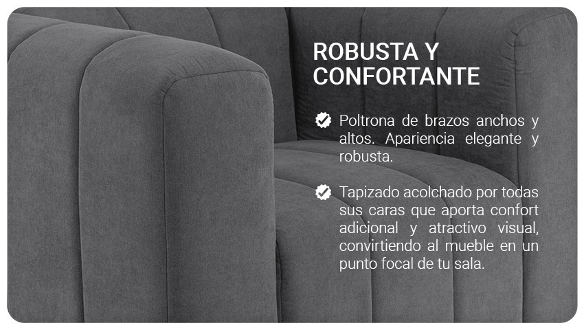 Cómoda y llamativa poltrona. Diseño moderno, tapizado en textil acolchado en forma acanalada que no solo destaca visualmente, sino que además aporta un grado adicional de comodidad. Es una poltrona de brazos altos que brinda una sensación de abrazo, lo cual invita a pasar un rato confortante. Combina fácilmente con cualquier estilo de ambiente, ideal para una sala, oficina e incluso un dormitorio.