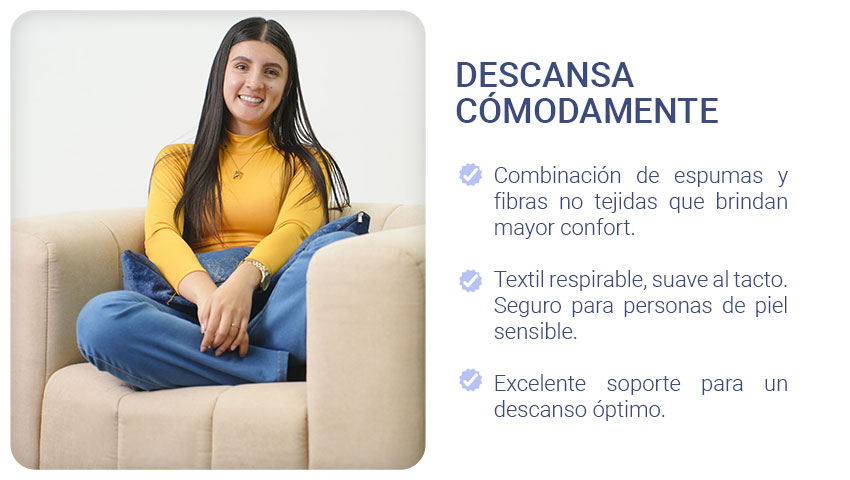 Estructura elaborada en madera seca reforestada, protegida contra hongos y gorgojos. Espuma de máquina continua fabricada en nuestra planta, esta tecnología de inyección garantiza la correcta dosificación de los componentes químicos para obtener un poro uniforme que brinda mayor soporte, evitando deformaciones y desgarramientos en la espuma. Adicionalmente se utiliza guata para elevar el confort y se tapiza en textiles resistentes de fácil cuidado. Utilizamos materia prima y mano de obra colombiana, combinando procesos artesanales con equipos de alta tecnología, producción 100% nacional.