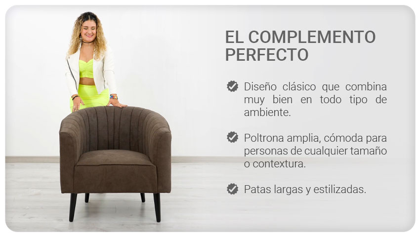 Su interior cuenta con un tapizado acolchado en forma acanalada que aporta mayor comodidad y una apariencia elegante. Sus patas largas no solo estilizan la poltrona, sino que además facilitan el proceso de limpieza de su sala, permitiéndole alcanzar con facilidad el espacio debajo del mueble.