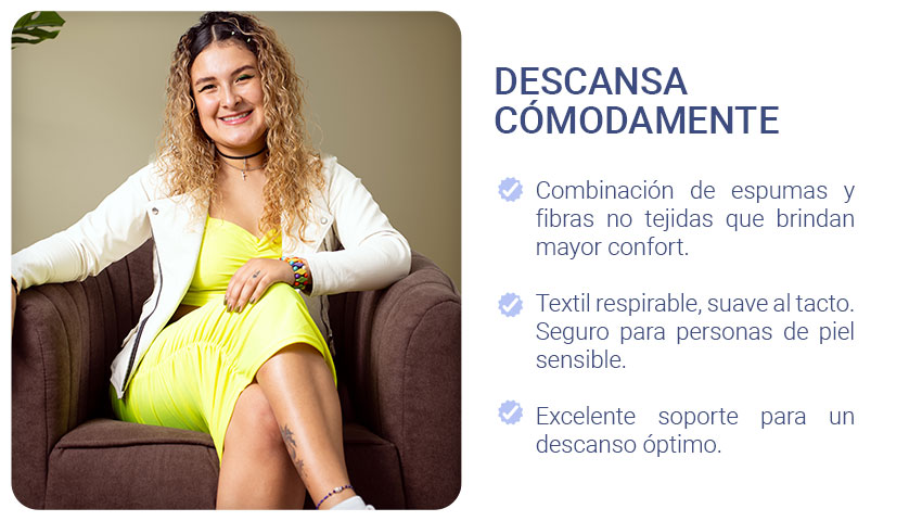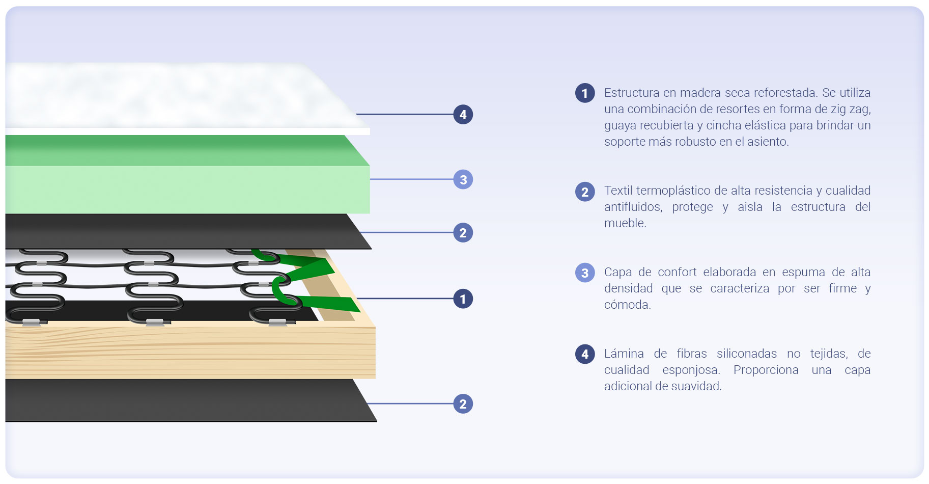 Estructura elaborada en madera seca reforestada, protegida contra hongos y gorgojos. Espuma de máquina continua fabricada en nuestra planta, esta tecnología de inyección garantiza la correcta dosificación de los componentes químicos para obtener un poro uniforme que brinda mayor soporte, evitando deformaciones y desgarramientos en la espuma. Adicionalmente se utiliza guata para elevar el confort y se tapiza en textiles resistentes de fácil cuidado. Utilizamos materia prima y mano de obra colombiana, combinando procesos artesanales con equipos de alta tecnología, producción 100% nacional.